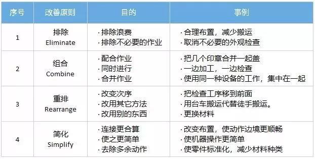程序分析法(ECRS):整體性制造過(guò)程各作業(yè)運(yùn)用剔除、合并、重排與簡(jiǎn)化使之合理化。